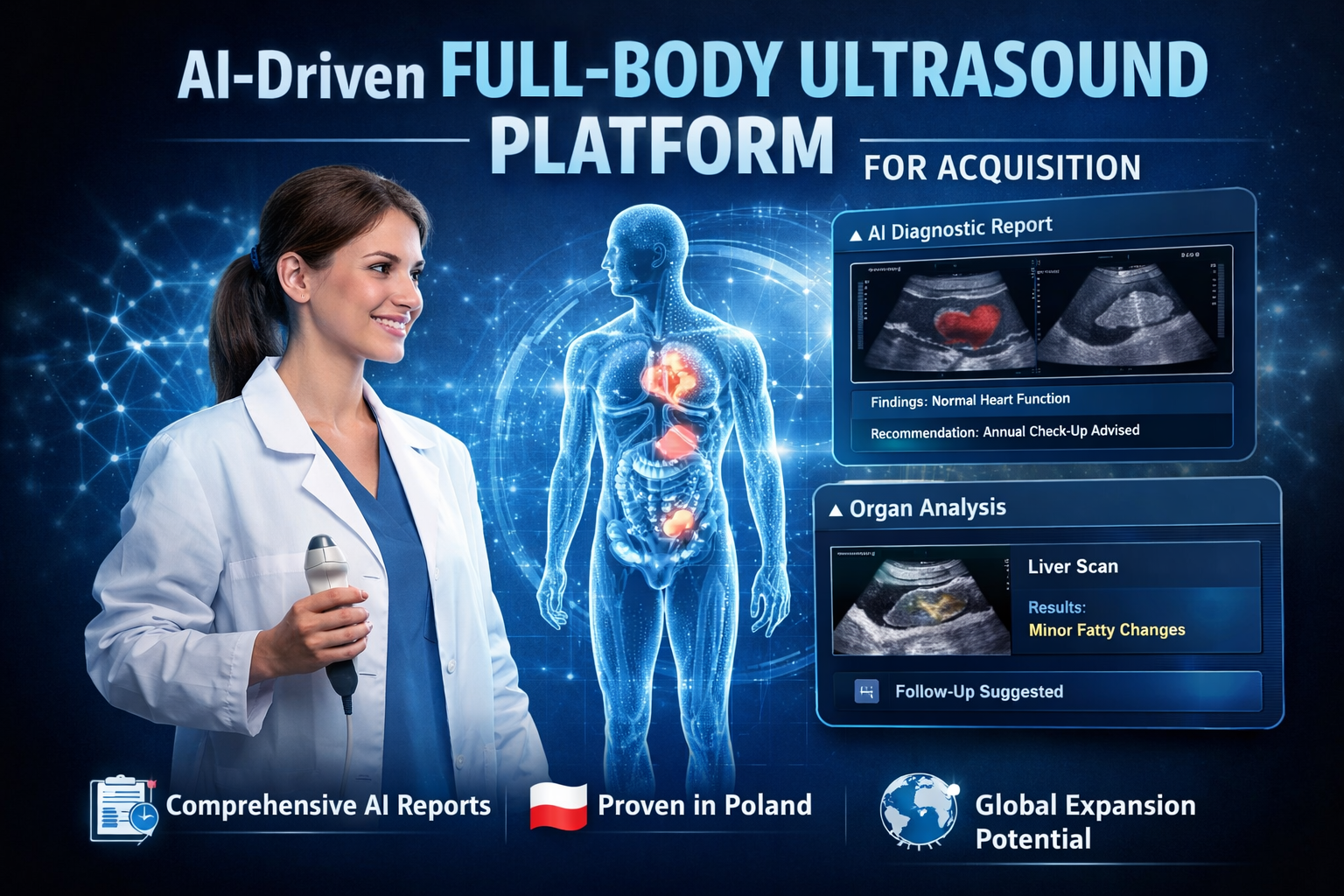 A cutting-edge, AI-supported full-body ultrasound screening platform is now available for acquisition / expansion. Currently operating with strong early traction in Poland, this next-generation preventive diagnostic model combines standardized full-body ultrasound exams with AI-generated, organ-by-organ reports that are easy for both patients and clinicians to understand.